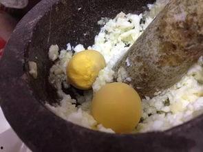 3. 将蒜泥、辣椒、香菜、芝麻等调料放入黏苞米糊糊中,再次搅拌均匀。